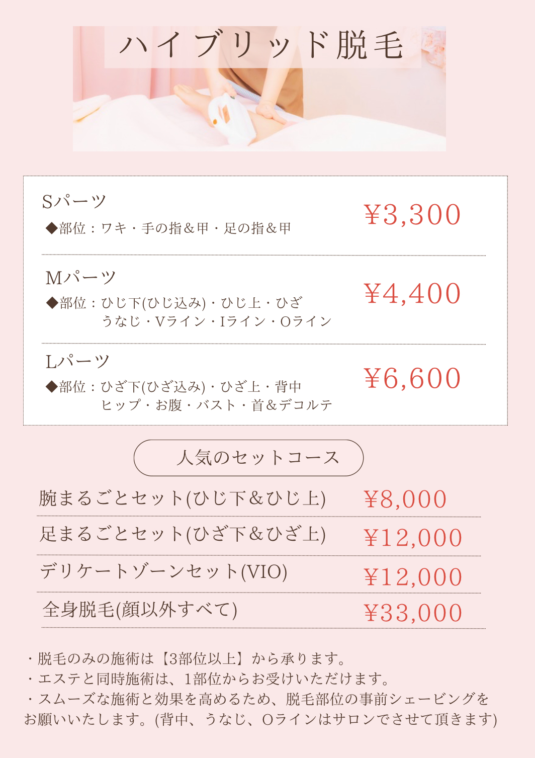 エステBerryの脱毛は、バルジ領域に熱を加え、発毛そのものを衰退させる「SHR方式」と、光エネルギーを毛のメラニンを介して、毛乳頭に直接影響を与える「IPL方式」両方の良いところを取り入れた今1番新しいハイブリッド脱毛(HHR方式)を採用しています。